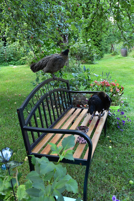 Kesän alussa mainitsin siitä, että meillä on puutarhassa muutamia penkkejä, mutta pääsääntöisesti ne jäävät koristeiksi, kun en malta istua pihalla. Fenix ja Hipsu ovat todenneet, että heillä kyllä on aikaa istuskella ihan kaikessa rauhassa puutarhapenkillä ja nauttia olostaan. Penkin välittömässä läheisyydessä kasvaa reilusti tomaatteja, joita neitokaiset käyvät syömässä välipalana. Melkoisen kekselijäitä ovat, kun jotain haluavat. Laitoimme tomaattien ympärille aidat, mutta äkkiähän nämä oppivat työntämään pään aidan raoista läpi niin pitkälle, että yltävät herkkuihin. Ja tänään Hipsu löytyi jo aitojen sisäpuolelta. Joten, antaa heidän sitten herkutella kaikessa rauhassa. Hupaisaa, kun ensin lepäilevät penkillä ja hetken kuluttua käyvät syömässä tomaatteja ja sen jälkeen palaavat takaisin penkilleen. Se jos mikä on elämästä nauttimista!